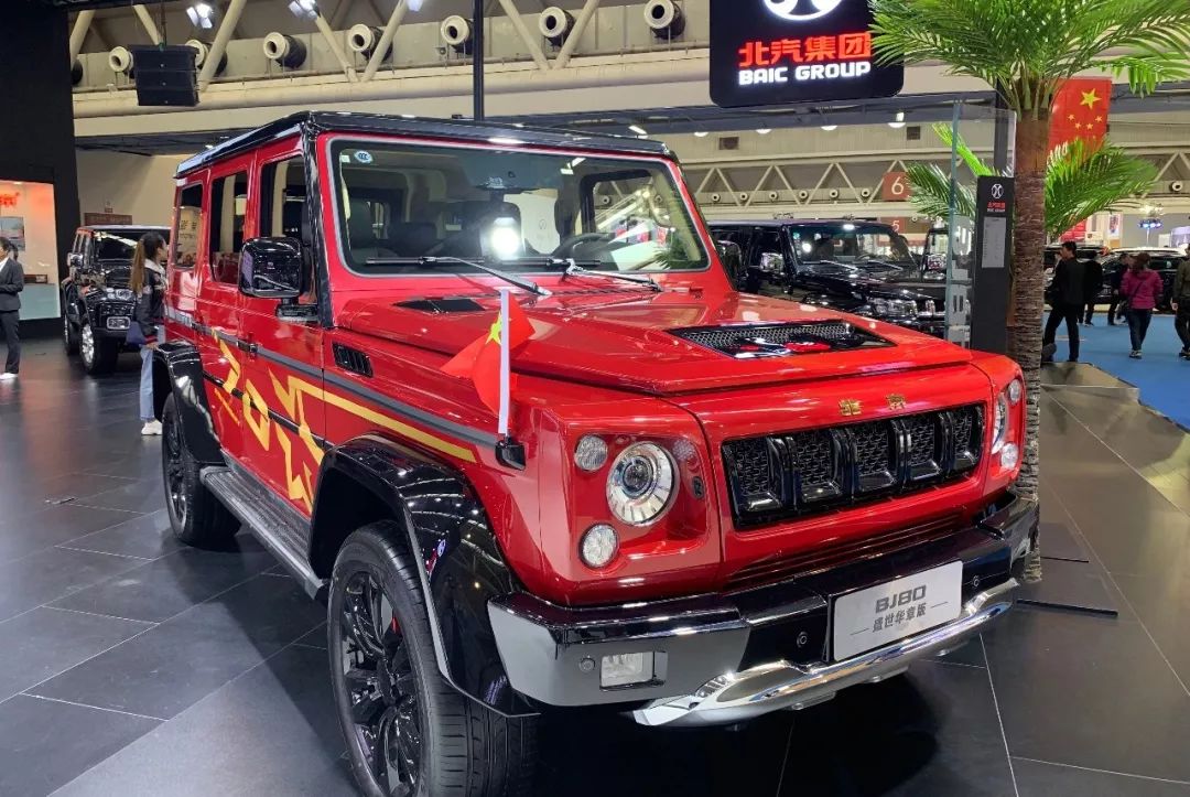 伴隨著國慶盛典的熱烈氣氛,BJ80盛世華章版在北汽集團展臺登場亮相。該車型采用火焰紅配色,車頂及后視鏡采用亮黑色涂裝設計,動力上配置2.3T渦輪增壓發動機及6速自動變速箱。